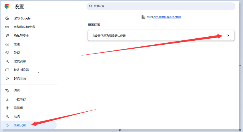 进入路径: 浏览器菜单 -> 设置 -> 重置设置 -> 将设置还原为默认值 -> 确认重置设置,